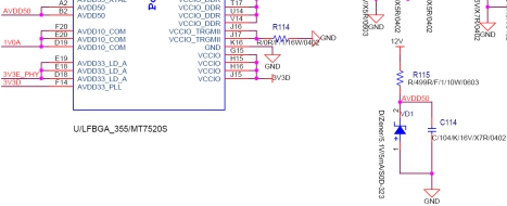 该ONU的5V电压由稳压管VD1提供,直接输入CPU的AVDD50的两个PIN脚。在AVDD50小于5V时,VD1未起到稳压作用;当AVDD50大于5V时,VD1将该点电压钳制在5V。值得注意的是,R115是该稳压管电路所必须的,它起到限流的作用,不致使稳压管损坏。以下将进行逐步分析。