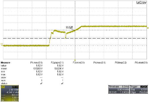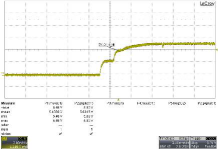当然,为了进行验证,在短时间实验下,我们将R115更改为200 Ohm电阻,则供电电流为34.5mA,测试结果如图19所示,5V上电波形已经没有台阶。