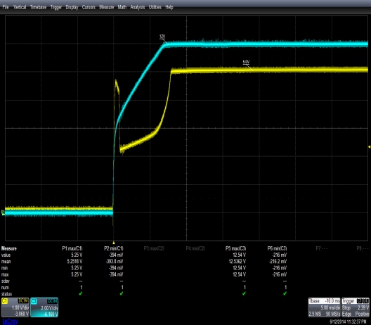 从图1、图7和图8这三张5V与3.3V时序图可以发现它们之间的一个共同点,即5V电压被下拉的时候,3.3V电压产生。由此可推断出,3.3V产生时CPU开始工作,过重的负载抽取电流,而此时12V未完全稳定(如图9),其电流(或者说功率)并不足以同时提供给5V和3.3V负载,因此5V被拉低。