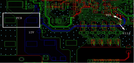 根据推测,5V上电台阶是由于后端负载太重抽取电流产生。查看PCB走线,发现提供给稳压管VD1产生5V的12V电压是在PC9前出线的(如图6所示),这将可能使5V在上电时由于容性负载而被拉低。
