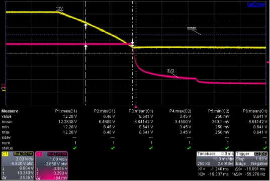 图17 R3=11kOhm满载时3.3V-12V掉电波形