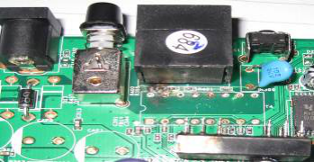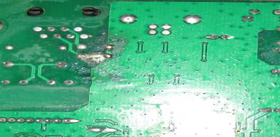 此处PCB的爬电距离约为4.5mm,正常情况下抗电强度可达到6KV以上;由于PCB表面残留有大量的助焊剂,使得PCB表面抗电强度明显降低,而在此处产生拉弧放电。