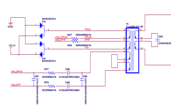 施加第三次浪涌电压时,样机损坏,表面无明显异常,DSL不能同步,电源适配器失效(无输出电压);样机3.3V-GND短路,网口75ohm电阻R400、R398阻值异常,AFE电路部分R377、R378(270ohm)电阻值变为:253ohm、1.4Kohm。