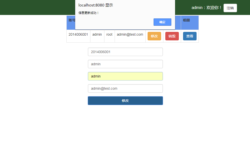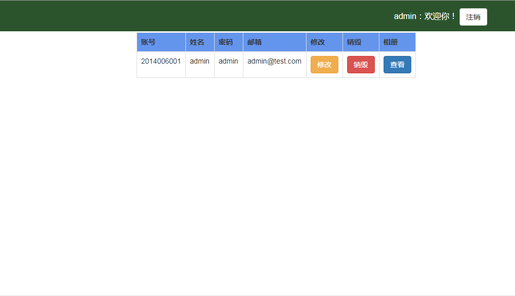1 <%@ page language="java" contentType="text/html; charset=UTF-8" 2 pageEncoding="UTF-8"%> 3 <%@ taglib prefix="c" uri="http://java.sun.com/jsp/jstl/core"%> 4 <!DOCTYPE html PUBLIC "-//W3C//DTD HTML 4.01 Transitional//EN" "http://www.w3.org/TR/html4/loose.dtd"> 5 <html> 6 <head> 7 <meta http-equiv="Content-Type" content="text/html; charset=UTF-8"> 8 <link rel="stylesheet" href="<%=request.getContextPath() %>/css/bootstrap.css" /> 9 <style type="text/css"> 10 .style_display{ 11 width: 360px; 12 display: none; 13 } 14 .style_display2{ 15 width: 360px; 16 } 17 </style> 18 <script type="text/javascript"> 19 function $(id){ 20 return document.getElementById(id); 21 } 22 function alterAdmin(){ 23 var display_element = $("AdminInfo"); 24 display_element.setAttribute("class","style_display2"); 25 } 26 function deleteAdmin(){ 27 window.location.href="<%=request.getContextPath() %>/admin/adminDelete.action"; 28 } 29 function adminLogout(){ 30 window.location.href="<%=request.getContextPath() %>/admin/adminLogout.action"; 31 } 32 function showPicture(){ 33 window.location.href="<%=request.getContextPath() %>/image/showImage.action"; 34 } 35 </script> 36 <title>AdminWelcome</title> 37 </head> 38 <body> 39 <!-- 消息弹出框提示 --> 40 <script type="text/javascript"> 41 var msg = "${error_msg}" 42 if (msg != "") { 43 alert("${error_msg}" ); 44 } 45 </script> 46 <div class="container-fluid"> 47 <!-- 48 作者:weixuhui@aliyun.com 49 时间:2018-02-08 50 描述:导航条 51 --> 52 <div class="row" style="background-color: #2B542C; height: 60px;"> 53 <div class="col-lg-3 col-md-3 col-lg-offset-9 col-md-offset-9" style="padding-top: 15px;"> 54 <font color="white" size="3px">${username }:欢迎你!</font> 55 <button class="btn btn-default" onclick="adminLogout()" >注销</button> 56 </div> 57 </div> 58 <!-- 59 作者:weixuhui@aliyun.com 60 时间:2018-02-08 61 描述:表单内容显示区 62 --> 63 <div class="row" style="margin-top: 2px;"> 64 <div class="col-lg-4 col-md-6 col-lg-offset-4 col-md-offset-3"> 65 <table class="table table-striped table-bordered table-hover"> 66 <tr style="background-color: cornflowerblue;"> 67 <th>账号</th> 68 <th>姓名</th> 69 <th>密码</th> 70 <th>邮箱</th> 71 <th>修改</th> 72 <th>销毁</th> 73 <th>相册</th> 74 </tr> 75 <tr> 76 <input type="hidden" value="${adminInfo.id }"/> 77 <td>${adminInfo.account }</td> 78 <td>${adminInfo.name }</td> 79 <td>${adminInfo.passwd }</td> 80 <td>${adminInfo.email }</td> 81 <td><button class="btn btn-warning" onclick="alterAdmin()">修改</button></td> 82 <td><button class="btn btn-danger" onclick="deleteAdmin()">销毁</button></td> 83 <td><button class="btn btn-primary" onclick="showPicture()">查看</button></td> 84 </tr> 85 </table> 86 </div> 87 </div> 88 <!-- 89 作者:weixuhui@aliyun.com 90 时间:2018-02-08 91 描述:修改内容区 92 --> 93 <center> 94 <div class="row style_display" id="AdminInfo" style="border-bottom: none;"> 95 <div > 96 <form action="<%=request.getContextPath() %>/admin/adminAlter.action" method="post"> 97 <input type="hidden" name="id" value="${adminInfo.id }" /> 98 <div class="form-group"> 99 <input type="text" name="account" class="form-control" id="account" value="${adminInfo.account }" style="width: 300px;"> 100 </div> 101 <div class="form-group"> 102 <input type="text" name="name" class="form-control" id="name" value="${adminInfo.name }" style="width: 300px;"> 103 </div> 104 <div class="form-group"> 105 <input type="text" name="passwd" class="form-control" id="passwd" value="${adminInfo.passwd }" style="width: 300px;"> 106 </div> 107 <div class="form-group"> 108 <input type="email" name="email" class="form-control" id="email" value="${adminInfo.email }" style="width: 300px;"> 109 </div> 110 <div> 111 <div><button type="submit" class="btn btn-primary" style="width: 300px;">修改</button></div> 112 </div> 113 </form> 114 </div> 115 </div> 116 </center> 117 </div> 118 </body> 119 </html>