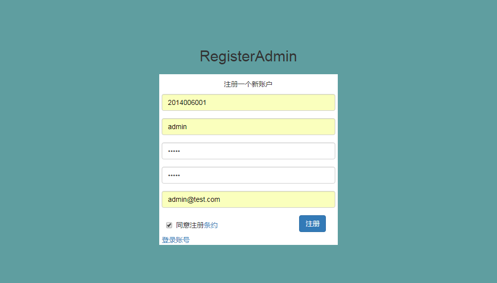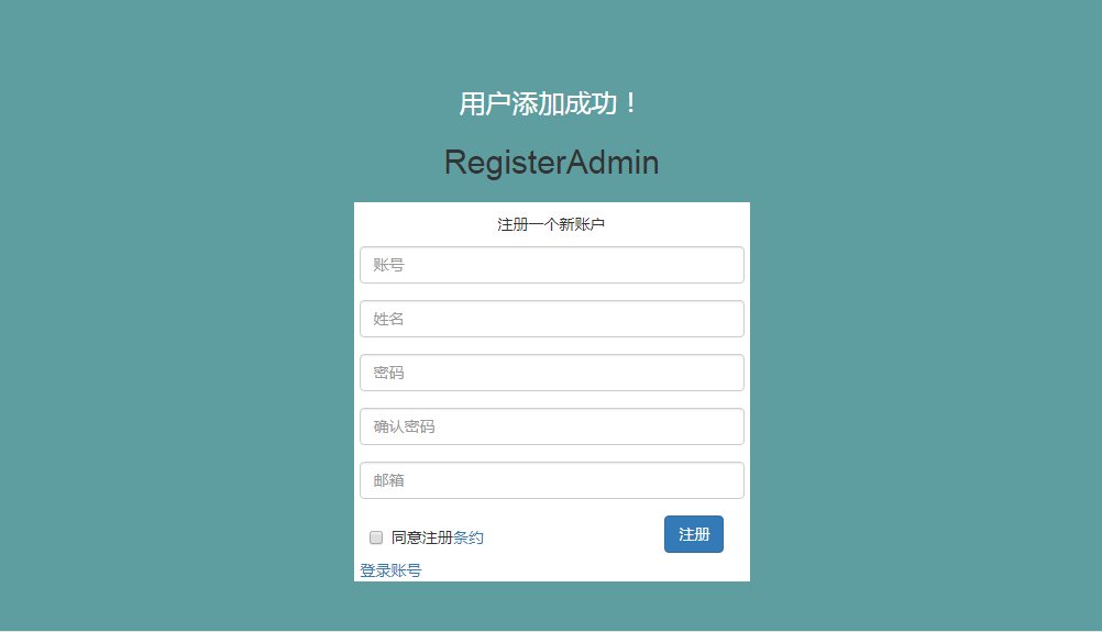 1 <%@ page language="java" contentType="text/html; charset=UTF-8" 2 pageEncoding="UTF-8"%> 3 <!DOCTYPE html PUBLIC "-//W3C//DTD HTML 4.01 Transitional//EN" "http://www.w3.org/TR/html4/loose.dtd"> 4 <html> 5 <head> 6 <meta http-equiv="Content-Type" content="text/html; charset=UTF-8"> 7 <link rel="stylesheet" href="<%=request.getContextPath() %>/css/bootstrap.css" /> 8 <style type="text/css"> 9 .div_login { 10 width: 360px; 11 height: auto; 12 margin-top: 1%; 13 background-color:white; 14 15 } 16 </style> 17 <title>Register Admin</title> 18 </head> 19 <body style="background-color:cadetblue"> 20 <div class="container-fluid"> 21 <div class="row" style="margin-top: 8%;"> 22 <center><font color="white" size="5px">${msg }</font></center> 23 <center><h2>RegisterAdmin</h2></center> 24 </div> 25 <div class="row"> 26 <center> 27 <div class="div_login"> 28 <div class="row"><center><p style="margin-top: 10px;">注册一个新账户</p></center></div> 29 <div class="row"> 30 <form action="<%=request.getContextPath() %>/admin/adminAdd.action" method="post"> 31 <div class="form-group"> 32 <input type="text" name="account" class="form-control" id="account" placeholder="账号" style="width: 350px;"> 33 </div> 34 <div class="form-group"> 35 <input type="text" name="name" class="form-control" id="name" placeholder="姓名" style="width: 350px;"> 36 </div> 37 <div class="form-group"> 38 <input type="password" name="passwd" class="form-control" id="passwd" placeholder="密码" style="width: 350px;"> 39 </div> 40 <div class="form-group"> 41 <input type="password" name="passwd_ref" class="form-control" id="passwd_ref" placeholder="确认密码" style="width: 350px;"> 42 </div> 43 <div class="form-group"> 44 <input type="email" name="email" class="form-control" id="email" placeholder="邮箱" style="width: 350px;"> 45 </div> 46 <div> 47 <div class="col-lg-5 col-md-5 checkbox"> 48 <label><input type="checkbox" name="remember">同意注册<a href="#">条约</a></label> 49 </div> 50 <div class="col-lg-4 col-lg-offset-3 col-md-4 col-md-offset-3"><button type="submit" class="btn btn-primary">注册</button></div> 51 </div> 52 </form> 53 </div> 54 <div class="row"><div class="col-lg-3 col-md-3"><a href="<%=request.getContextPath() %>/login.jsp">登录账号</a></div></div> 55 </div> 56 </center> 57 </div> 58 </div> 59 </body> 60 </html>