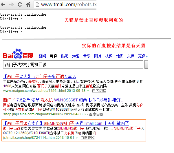 图的上面部分中,在天猫的robots.txt中明确禁止百度蜘蛛爬取的