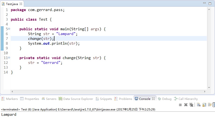 由上图可知,字符串 String 类型产生的对象,是存储在堆中的非基本类型。根据以上看法,这种参数传递方式应该是引用传递,那么对字符串做出的修改应该会保存到 change(String) 方法之外,然而最终的输出结果并不是这样。把 String 改成 StringBuffer,做类似的操作,得出的结果也和 String 一致的。