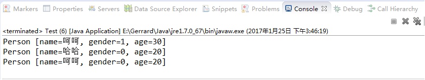 1 public static void main(String[] args) { 2 Person p1 = new Person(); 3 p1.setAge(20); 4 p1.setGender(0); 5 p1.setName("哈哈"); 6 Person p2 = new Person(); 7 BeanUtil.copySameFieldsObject(p1, p2); 8 Person p3 = new Person(); 9 BeanUtil.copySameFieldsObject(p1, p3); 10 change1(p1); 11 System.out.println(p1); 12 change2(p2); 13 System.out.println(p2); 14 change3(p3); 15 System.out.println(p3); 16 } 17 18 private static void change1(Person p) { 19 p.setAge(30); 20 p.setGender(1); 21 p.setName("呵呵"); 22 } 23 24 private static void change2(Person p) { 25 p = new Person("呵呵", 1, 30); 26 } 27 28 private static void change3(Person p) { 29 p.setName("呵呵"); 30 p = new Person("呵呵", 1, 30); 31 }