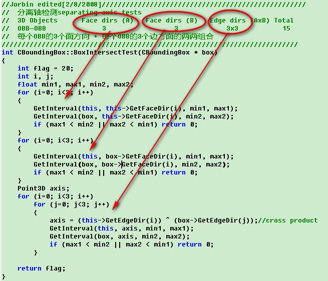 OBB间的相交测试基于分离轴理论(separating axis test)。若两个OBB在一条轴线上(不一定是坐标轴)上的投影不重叠,则这条轴称为分离轴。若一对OBB间存在一条分离轴,则可以判定这两个OBB不相交。对任何两个不相交的凸三维多面体,其分离轴要么垂直于任何一个多面体的某一个面,要么同时垂直于每个多面体的某一条边。因此,对一对OBB,只需测试15条可能是分离轴的轴(每个OBB的3个面方向再加上每个OBB的3个边方面的两两组合),只要找到一条这样的分离轴,就可以判定这两个OBB是不相交的,如果这15条轴都不能将这两个OBB分离,则它们是相交的。