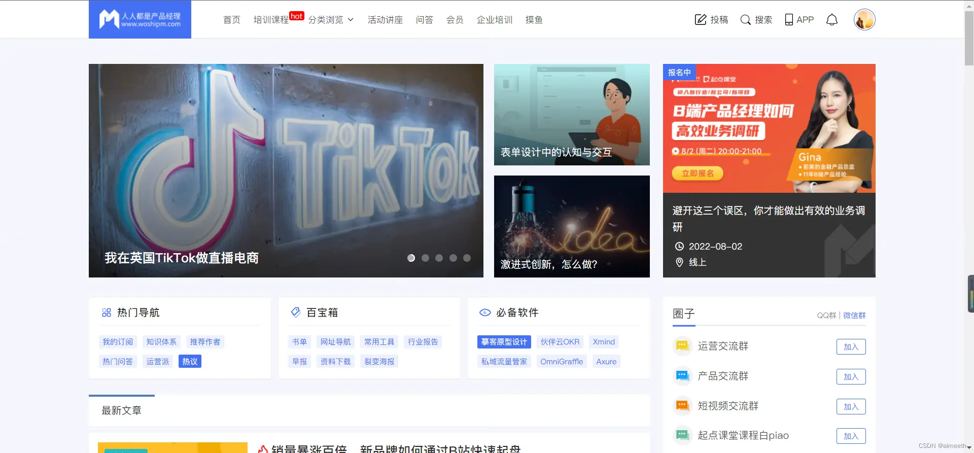 这个我想我也不用过多介绍了,这个应该是国内产品人最大的知识社区了。我最早期接触产品工作产品技能都是从这个网站上学习到的。作为一个野生的产品经理,从需求分析,需求管理到PRD撰写,项目管理等都是在这个网站上学习到的。所以对一个产品人是非常有帮助的。