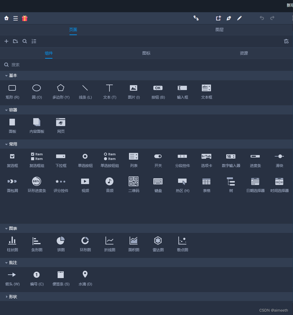 摹客RP除了提供同类设计软件包含的矩形、圆形、输入框这样的基本元件,还为了让原型的质量更高,在组件中加入了包括:图表、视频、进度条开关、分段控件、选项卡、数字输入器等24个常用组件,以及柱状图、条形图、饼图在内的8个图表组件。