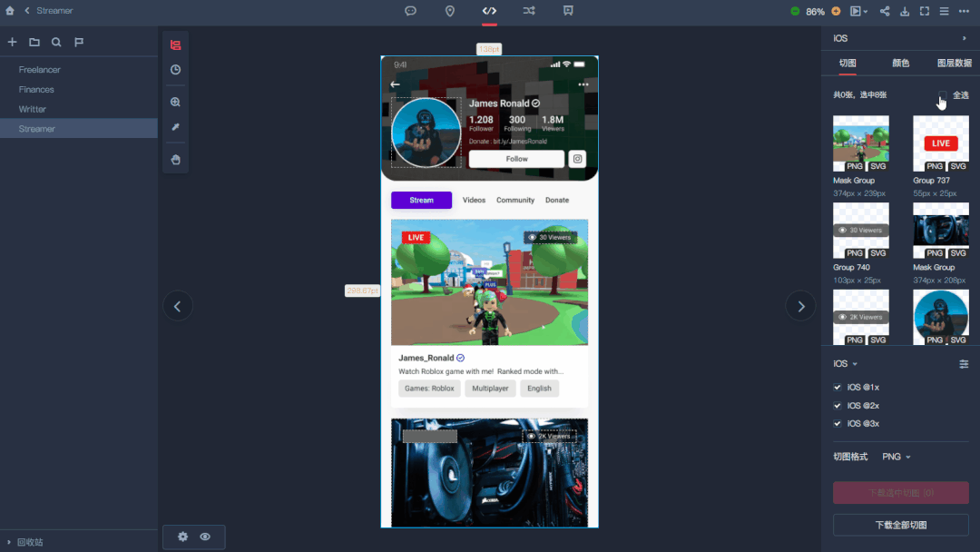 为了提升效率,摹客还提供批量导出切图功能,选中多个页面点击鼠标右键,即可一键下载多个页面的切图。