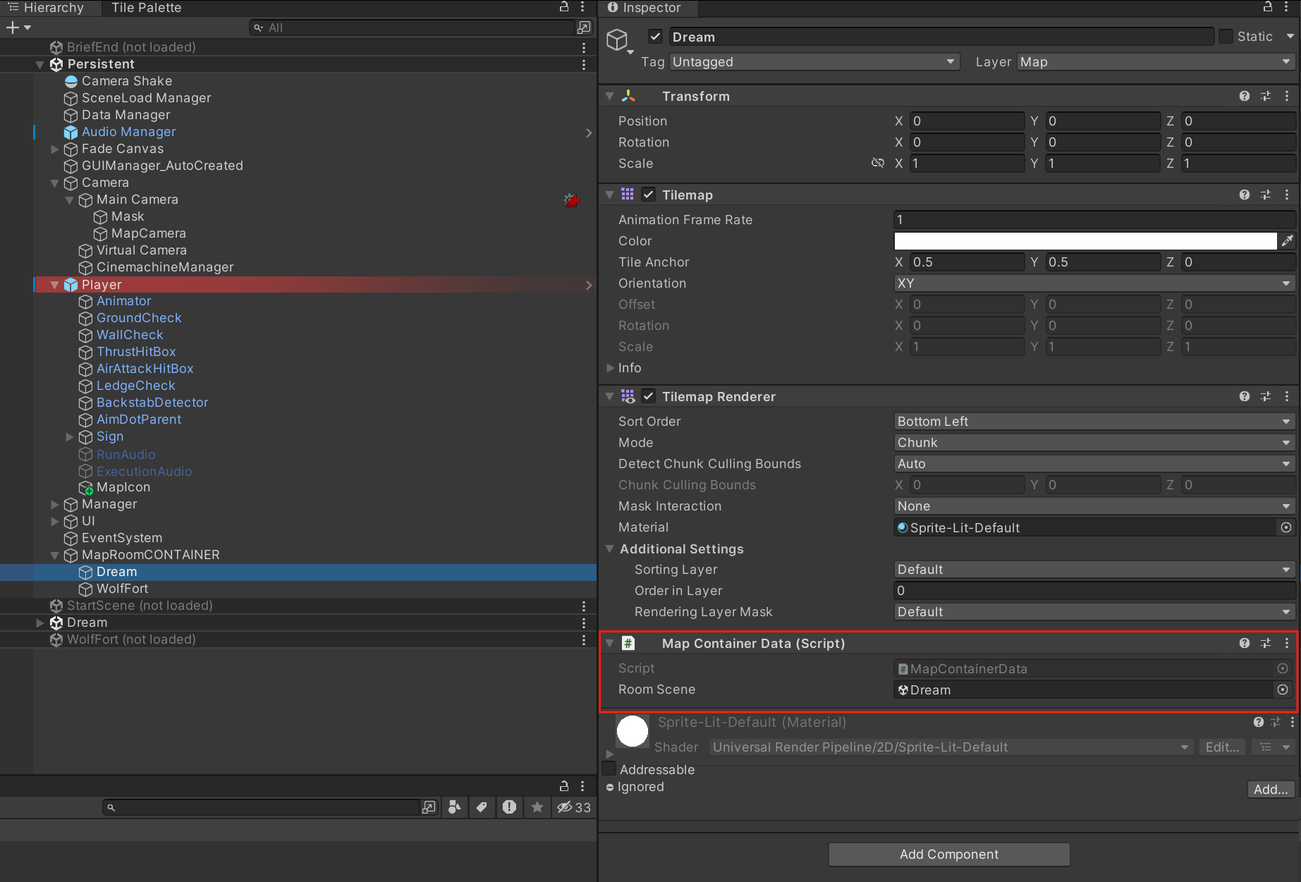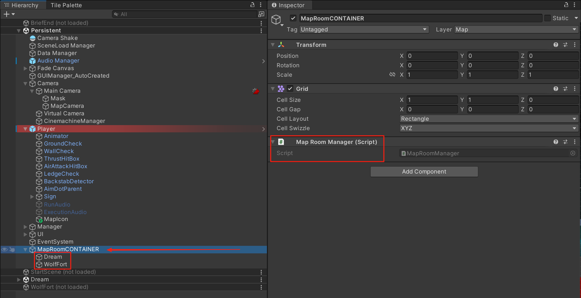 然后是地图解锁的功能,思路是把不同的房间用场景分隔开,然后绑定场景和瓦片地图的关系,再场景加载的时候打开和关闭显示,下面是代码