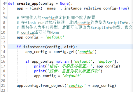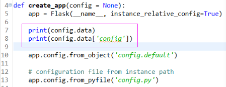 因为这里传入的是字典,所以,在create_app()函数运行后接收到的也是字典(而不是默认的ScriptInfo,当然,也可以在程序中创建ScriptInfo对象来传入配置数据,或许和instance的位置有关系),函数中的操作也主要是对字典类型的config的类型判断和数据读取。