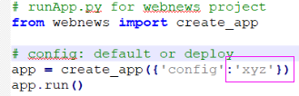 1 # runApp.py for webnews project 2 from webnews import create_app 3 4 # config: default or deploy 5 app = create_app({'config':'defaul1t'}) 6 app.run()