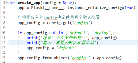 在上面的程序定义下,create_app只可以传入一个参数,可以是字典,也可以为None,也可以为其它任何类型,但是,程序中只对字典类型进行了判断并处理,如果不是字典,那么,忽略,并使用默认配置启动。