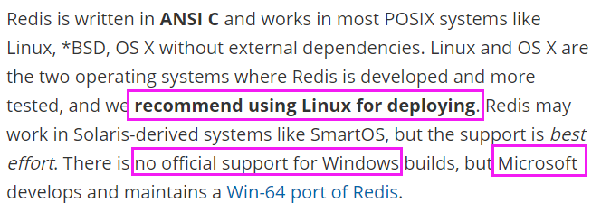 关于Redis在Windows上安装,不建议!Redis官方没有支持,仅仅推出了一个第三方软件,而这个也很久没有更新了,支持的Redis版本严重滞后!请参考官文Introduction最后一段:
