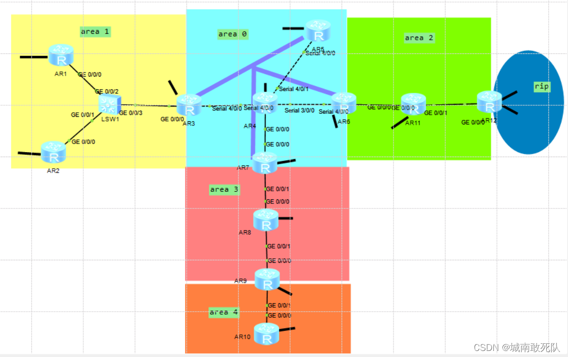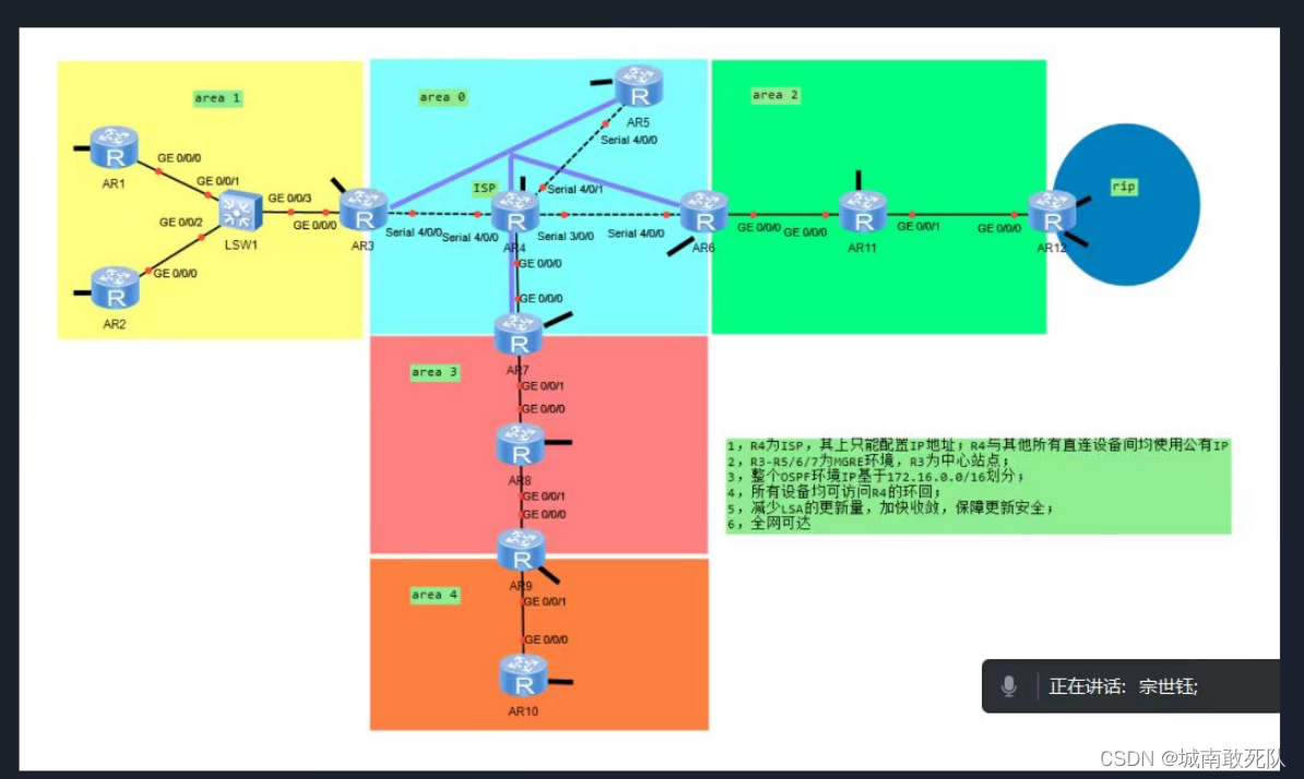 文章详细描述了如何搭建网络环境,包括地址规划,如RIP和OSPF协议的路由器地址分配,以及IP配置、NAT、MGRE的设置。同时,文章还涵盖了OSPF配置、接口认证和加快收敛的策略,如域间路由汇总和特殊区域的设定。