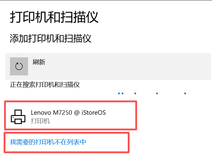 电脑添加打印机。打开“设置”“设备”“打印和扫描仪”“添加打印机或扫描仪”,一般情况会出现打印名称,若没有出现就点击“我需要的打印机一在列表中”,“按名称选择共享打印机”,输入“http://192.168.1.1:631/printers/Lenovo_M7250”,“下一步”安装。
