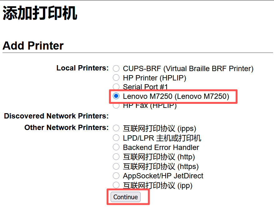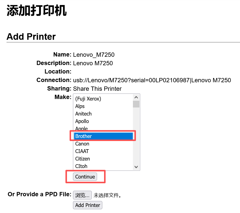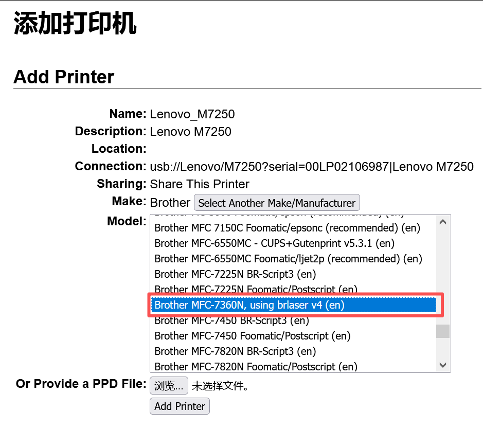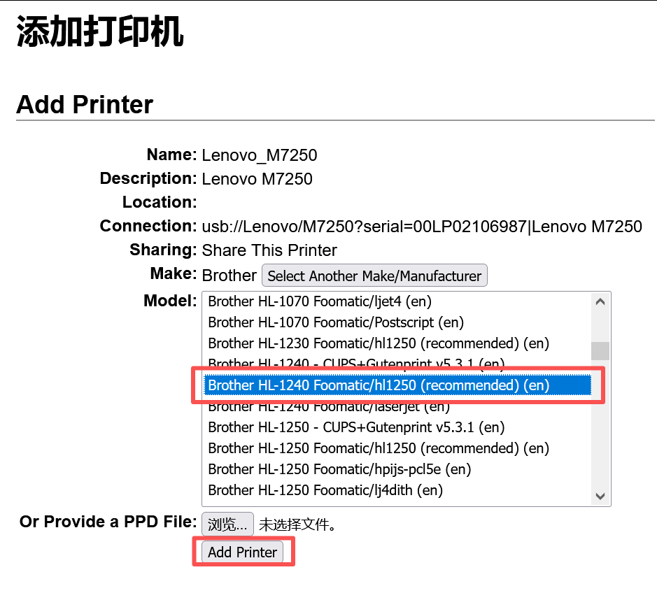 如:“https://192.168.1.1:631”,点击“Adminisration”、“Add Printer”,账号和密码都是“admin”,打印机驱动选择“Brother HL-2140”或“Brother MFC-7360N”都可以。