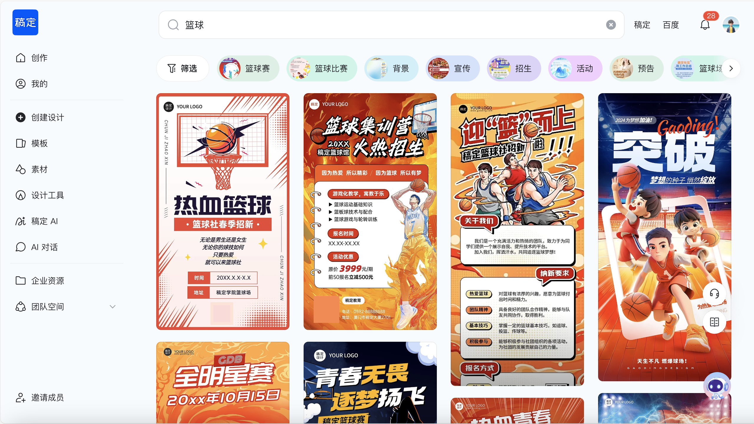 稿定设计凭借其丰富的资源库和直观的操作界面,让篮球海报制作变得前所未有的简单和高效。