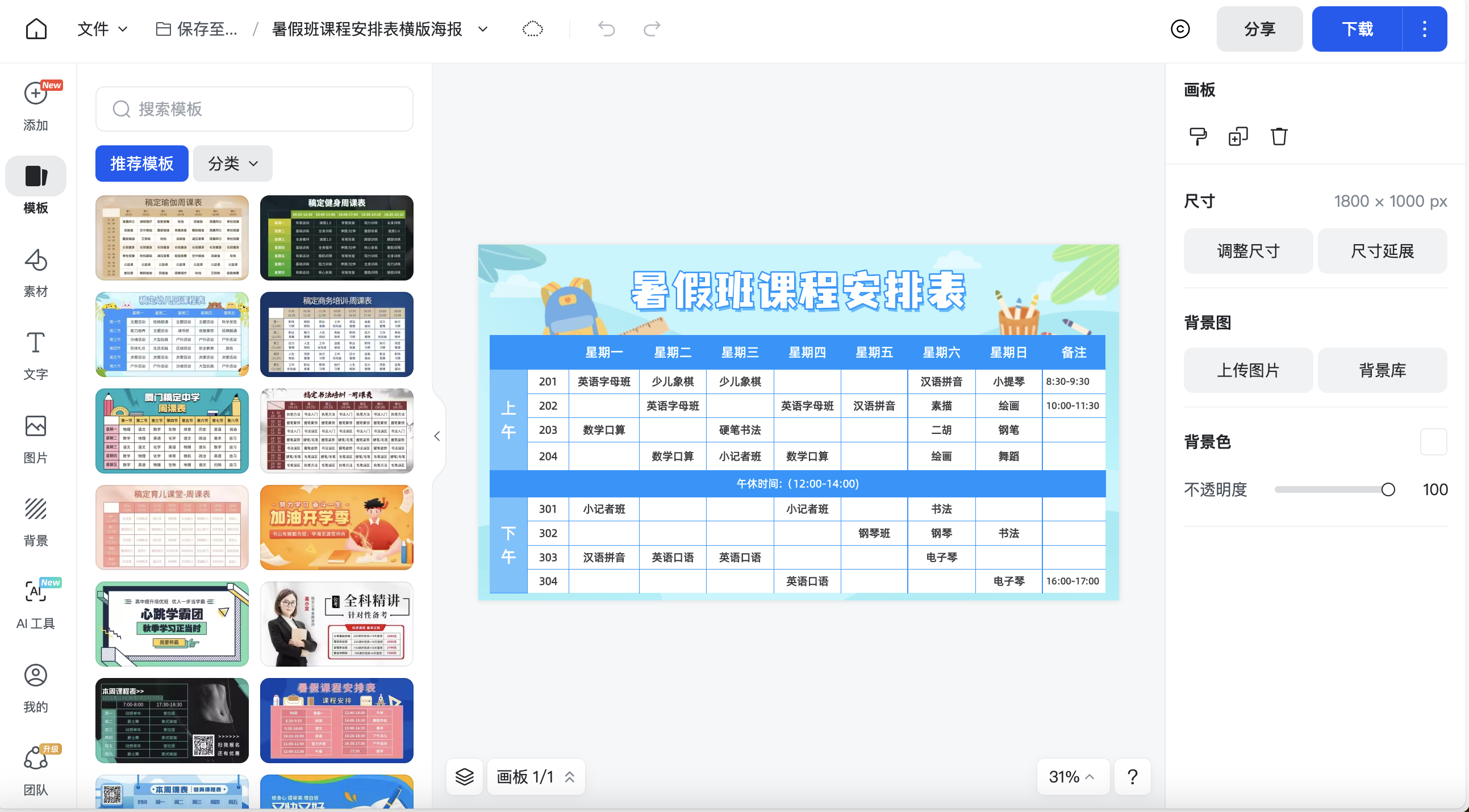 对于教育行业的老师和学生而言,课程表是日常教学与学习的核心指引——老师通过课表统筹教学进度,学生依赖课表规划学习节奏。但传统课表制作常因布局混乱、视觉冗余导致信息传递效率低,随着在线设计工具的普及,通过模板优化与科学排版,就能快速做出实用与美观兼具的课表。