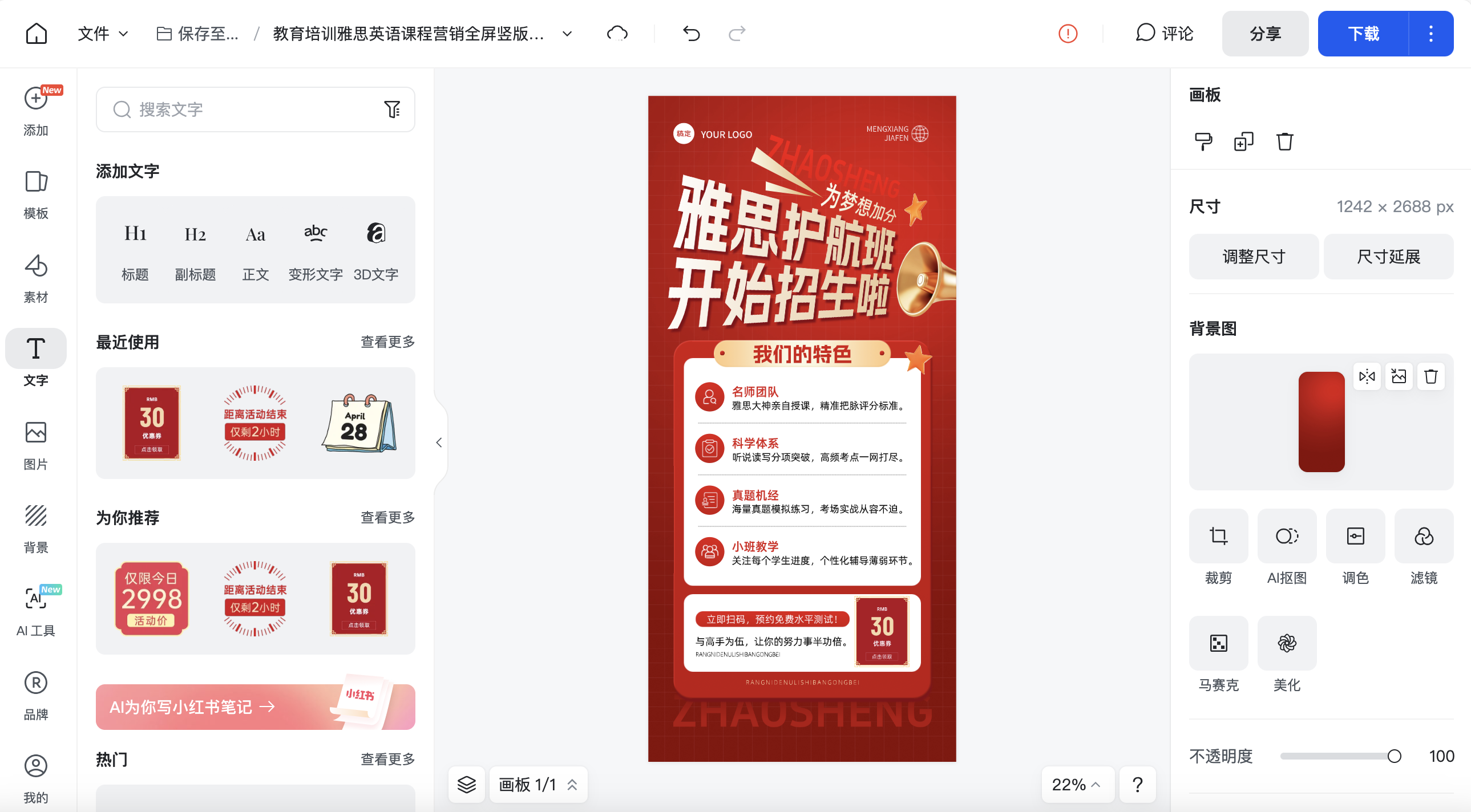 - 教育机构:某少儿英语培训班需要做招生海报,选“教育-招生-活泼风”模板,添加课程信息(“周末启蒙班,99元体验课”)、上课时间和地址,再插入几张学员上课的照片,配色用模板自带的“橙+蓝”(符合儿童的视觉偏好),半天就做出了10张不同风格的海报,贴在小区和学校门口,咨询量比之前的纯文字海报提升了40%。