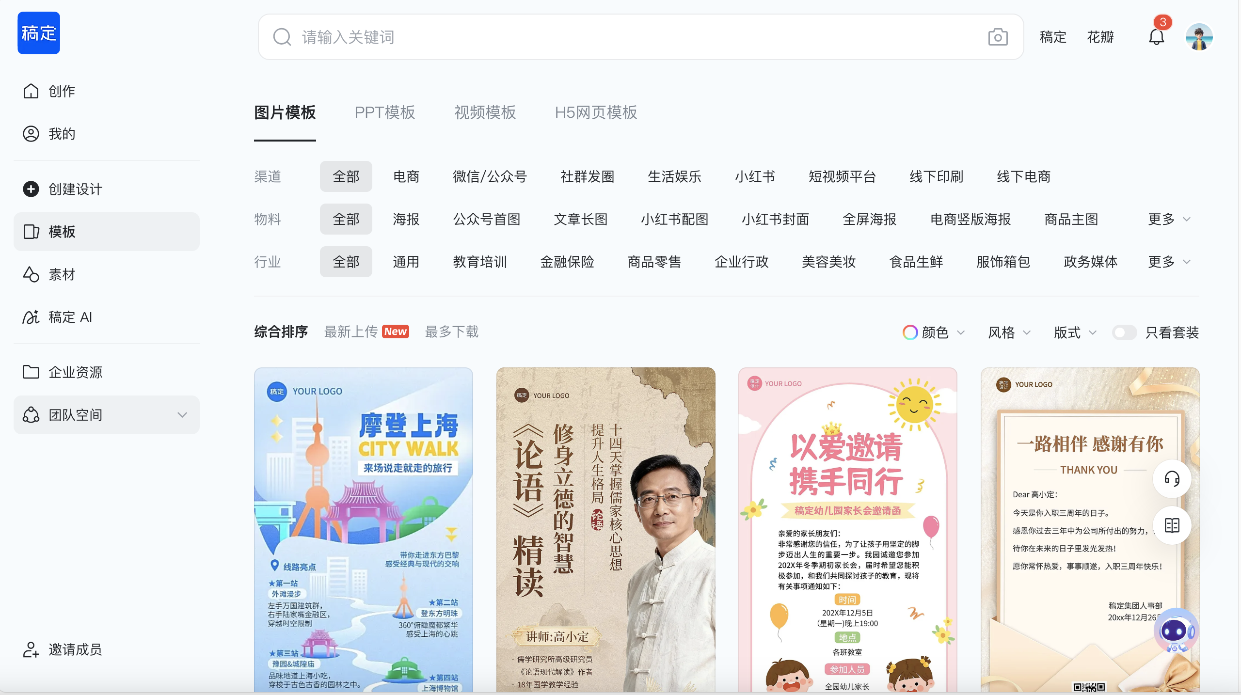 稿定的模板库不是笼统的“海报”“PPT”分类,而是按“行业+场景+风格”三重维度细分——比如电商行业下有“618活动”“新品发布”“清仓促销”等场景,每个场景下又有“极简风”“国潮风”“科技风”等风格选项。这种细分的价值在于“降低决策成本”:当一个卖女装的中小卖家想做“秋季上新”海报时,直接选择“电商-秋季上新-极简风”模板,就能快速找到符合行业属性、场景需求和目标人群审美(女装用户偏好简洁、高级感)的基础框架,无需在海量模板中逐一筛选。