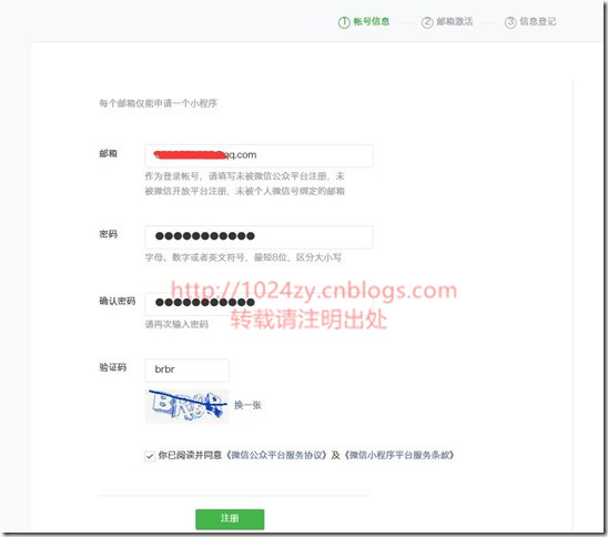 3、使用一个没有注册过公众平台的邮箱来注册小程序,填写邮箱,密码,验证码,填写完后,点击:“注册”按钮