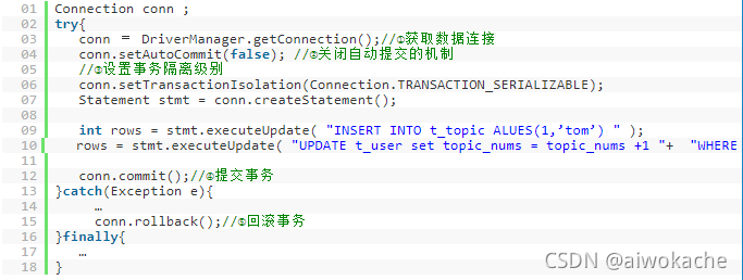 Connection默认情况下是自动提交的,也即每条执行的SQL都对应一个事务,为了能够将多条SQL当成一个事务执行,必须先通过Connection的setAutoCommit(false)阻止Connection自动提交,并可通过Connection的setTransactionIsolation()设置事务的隔离级别,Connection中定义了对应SQL 92标准4个事务隔离级别的常量。通过Connection的commit()提交事务,通过Connection的rollback()回滚事务。下面是典型的JDBC事务数据操作的代码: