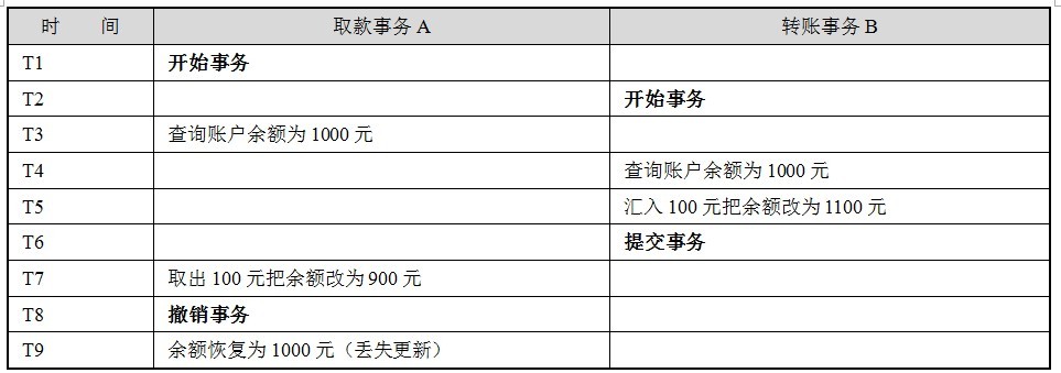 上面的例子里由于支票转账事务覆盖了取款事务对存款余额所做的更新,导致银行最后损失了100元,相反如果转账事务先提交,那么用户账户将损失100元。