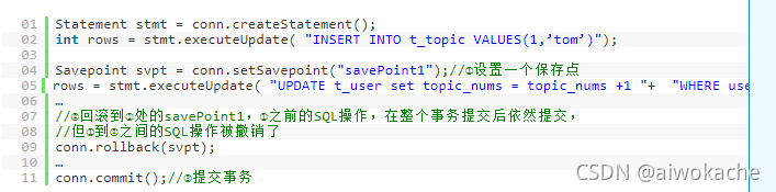 下面的代码使用了保存点的功能,在发生特定问题时,回滚到指定的保存点,而非回滚整个事务: