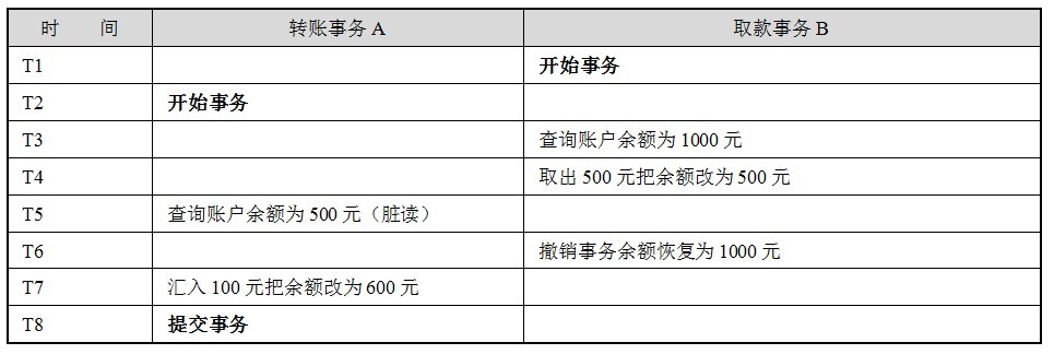 A事务读取B事务尚未提交的更改数据,并在这个数据的基础上操作。如果恰巧B事务回滚,那么A事务读到的数据根本是不被承认的。来看取款事务和转账事务并发时引发的脏读场景: