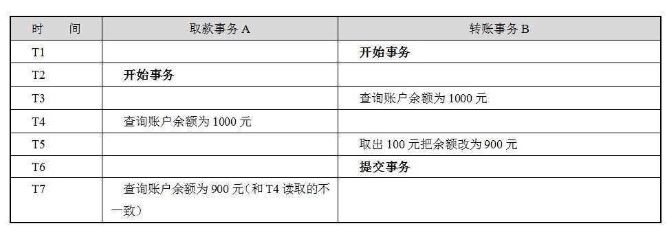 不可重复读是指 A事务读取了B事务已经提交的更改数据。假设A在取款事务的过程中,B往该账户转账100元,A两次读取账户的余额发生不一致: