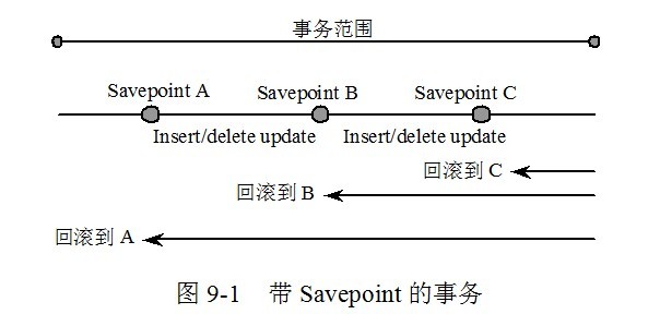 在JDBC 2.0中,事务最终只能有两个操作:提交和回滚。但是,有些应用可能需要对事务进行更多的控制,而不是简单地提交或回滚。JDBC 3.0(JDK 1.4及以后的版本)引入了一个全新的保存点特性,Savepoint 接口允许用户将事务分割为多个阶段,用户可以指定回滚到事务的特定保存点,而并非像JDBC 2.0一样只回滚到开始事务的点,如下图所示: