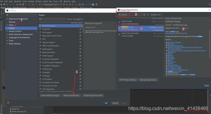 在输入框输入”lombok”,得到搜索结果,点击安装,然后安装提示重启 IDEA,安装成功;