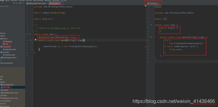 - 当我们对流进行操作,我们通常需要调用close方法来关闭或结束某资源,而@CleanUp注解可以帮我们调用close方法,并且放到try/catch块中进行处理,如下图: