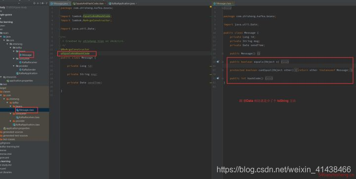 - 该注解应用在类上,使用该注解,lombok会为我们生成 equals、canEqual、hashCode 方法,包括所有非静态属性和非transient的属性;同样可以使用exclude属性禁止在toString方法中使用某字段,而of可以指定需要使用的字段;也可以通过callSuper属性在重写的方法中使用父类的字段,这样我们可以更加灵活的定义bean的比对,如下图: