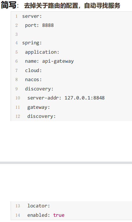 要明白:uri中第一部分就是为了防止各个项目中出现重名路径导致路由转发失败。server: port: 9000 spring: application: name: gateway-demo cloud: gateway: discovery: locator: enabled: true # 开启当前项目服务注册与发现功能 lower-case-service-id: true # 把服务名转换为小写,Eureka中默认都是大写 routes: - id: demo #自定义唯一标识,只要不重复即可 uri: lb://EUREKA-CLIENT # lb:loadBalance EUREKA-CLIENT 代理项目的名 predicates: Path=/demo/** # 路径规则 filters: StripPrefix=1 # 转发后忽略第一层 -