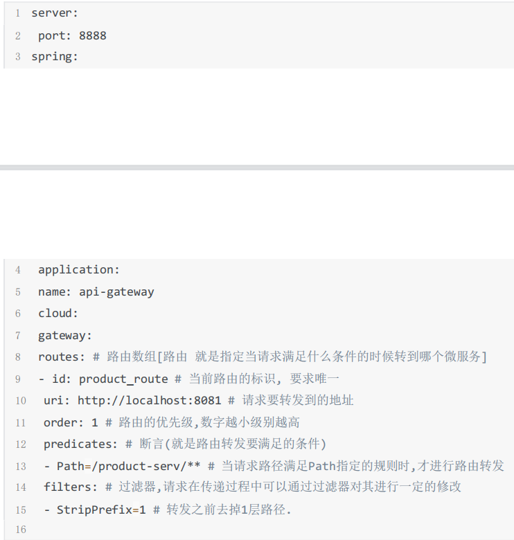 <!-- gateway网关 --> <!-- 注意:会和spring-webmvc的依赖冲突,需要排除spring-webmvc --> <dependency> <groupId>org.springframework.cloud</groupId> <artifactId>spring‐cloud‐starter‐gateway</artifactId> </dependency> - 第二步:编写yml配置文件
