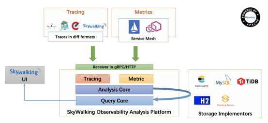 - 右部分Storage:Tracing数据存储,目前支持ES、MySQL、Sharding Sphere、TiDB、H2多种存储器,目前采用较多的是ES,主要考虑是SkyWalking开发团队自己的生产环境采用ES为主;