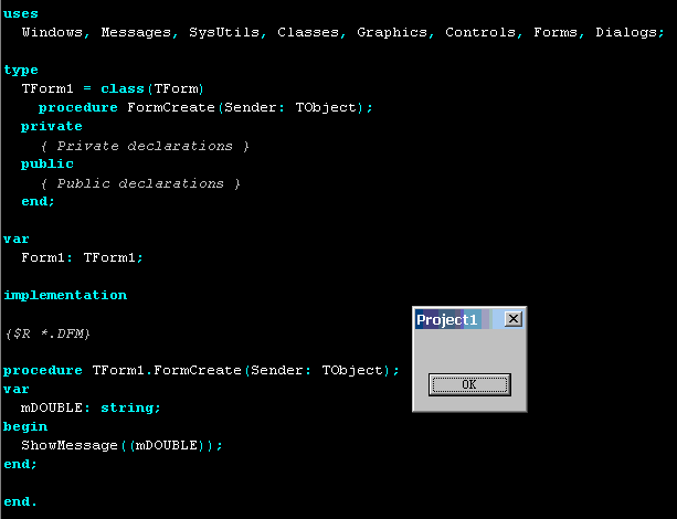 1.如下图:申明一Double型变量, 然后直接把它Show出来, 发现变量没有初始化的值不是零哦(^_^我错以为Delphi会给它默认个零呢)