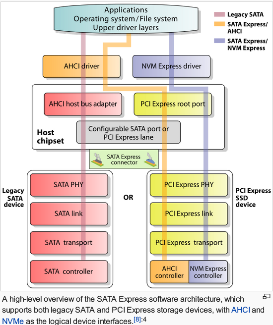 在主板芯片层面,有 AHCI 控制器和 PCIe 控制器。有趣的是 AHCI 驱动程序“居然”可以使用 PCIe 控制器(中间那条橙色的线)。这个其实是个过渡方案,目的是在利用 PCIe 高带宽的同时,保持对上层软件的兼容性。目前在笔记本上,用这个方案的产品并不多。楼主也不觉得会成为主流。