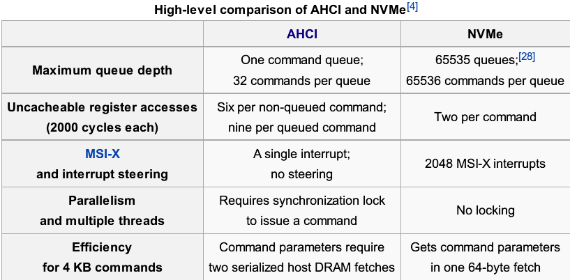 前面说过,AHCI 是为了发挥 SATA 的潜能而设计的,当时算是“高大上”了。但当时仍然是机械硬盘统治市场,因此 AHCI 的设计是基于机械硬盘的特性(旋转式磁性盘片)。虽然 AHCI 也可以用于 SSD,但却不能发挥极致。因为 SSD 更像内存,而不像“盘片”。譬如说,机械硬盘,如果磁头错过了一个扇区,那就得等盘片转一圈回来才能访问。SSD 就不存在这个问题。因此,业界重新设计一个新的 NVMe 协议,希望发挥 SSD 的潜能。下面是 AHCI 和 NVMe 的对比: