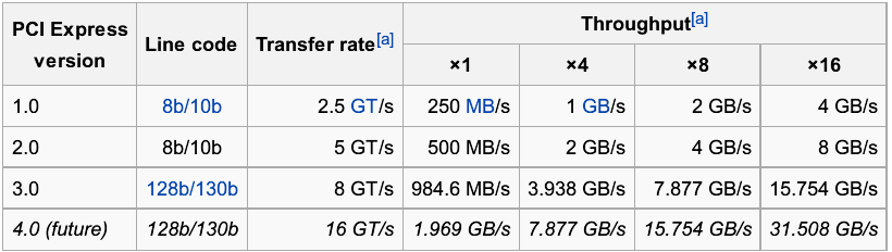 以下是 PCIe 各版本的对比。注意在同一个版本中,也有不同的速率,取决于产品使用多少条通道(Lane)。