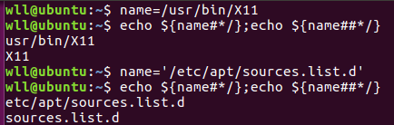 (6)在 shell 命令终端输入 name=/usr/bin/X11,然后使用 echo 分别显示表达式①和②的值,观察结果。 修改 name 的值,让 name='/etc/apt/sources.list.d',再次使用 echo 分别显示表达式①和②的值,观察结果。 结合结果,写出表达式的作用。 ① ${name#*/} ② ${name##*/}
