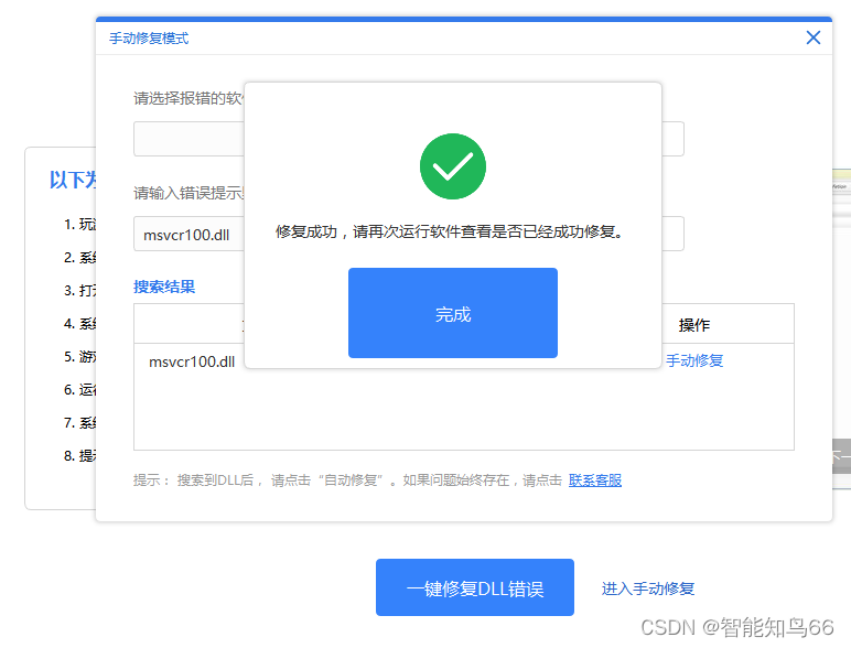 最后就是关机重启一下就能修复msvcr100.dll完成。(也可以选择手动修复,在dll修复工具上,选择手动修复,然后输入msvcr100.dll文件,直接查找,下载安装就可以了。)