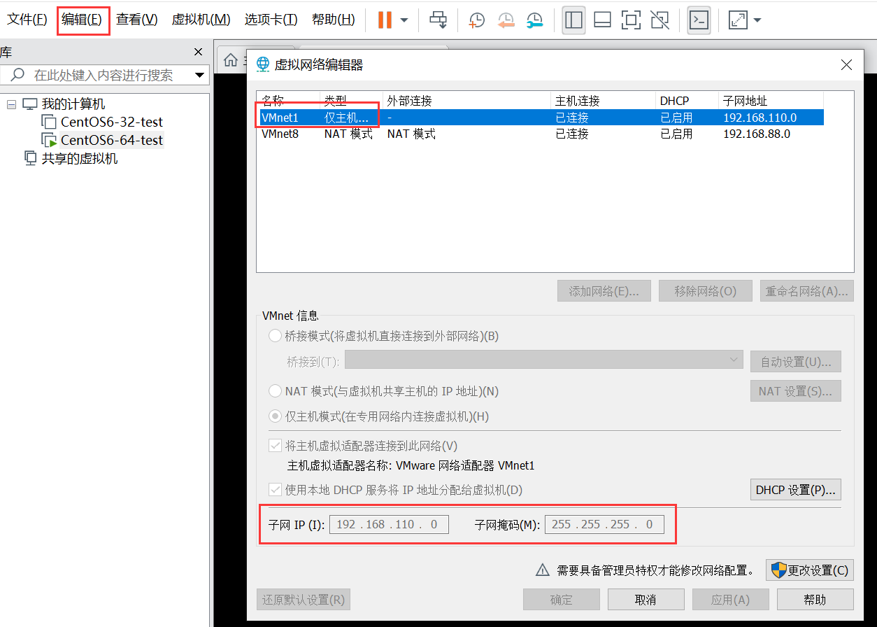 (1)点击左上角菜单栏 编辑-虚拟网络编辑器。VMent1即为主机模式的配置,记下子网IP(192.168.110.0)和子网掩码(255.255.255.0)