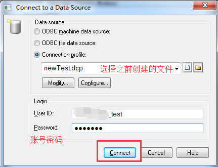 7,点击确认后,会回到Connect to a Data Source窗口,选择Connection Profile,选择上面生成的文件,填写数据库账号密码,点击connect