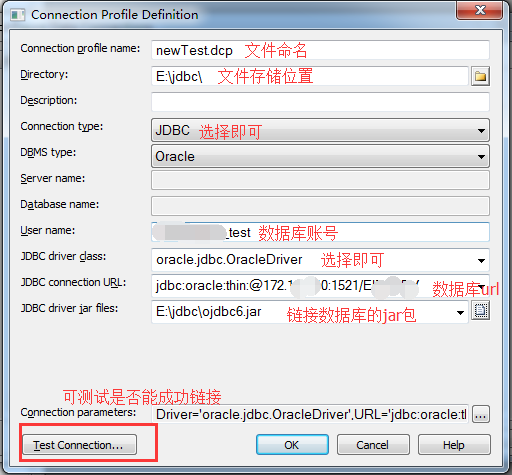 6,新窗口Connection Profile Definition打开后,填写数据库信息,测试连接成功后,选择生成的文件